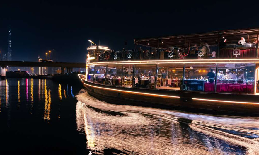 Explore the very famous and rich Dhow cruise dinner experience with Excellent Way Tours Dubai Water cruise. This journey as you sit on the cruise for a delicious gourmet dinner is much more than just the elegant dining experience. Witness the gorgeous view of Dubai as you cruise your way through the river experience the cultural shows of Dubai and be greeted by the very famous Arabic drink kahwah which will delight the tastebuds and prepare you for an unforgettable journey of food, music, and dance.